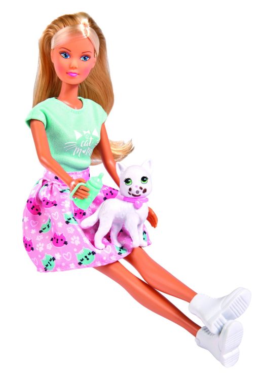 Steffi poarta o rochie la moda, si pleaca la plimbare impreuna cu pisicuta ei, plus multe accesorii. �Papusa Steffi are grija de pisicuta. Poarta o rochie verde si roz, cu pisici si pantofi albi. Pisicuta este alba si are fata murdara. Este suficient sa umeziti carpa atasata setului cu apa calda si sa stergeti gura, iar murdaria va disparea. Accesoriile pentru ingrijirea unui animal de companie includ: un castron pentru mancare si apa, o minge de lana, o sticla.