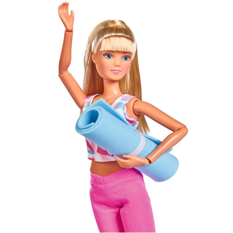 Papusa Steffi poarta o tinuta sportiva, cu corpul complet articulat in 14 puncte, setul include covoras sport si sticla de baut. Steffi nu numai ca iubeste moda, dar exceleaza si intr-o varietate de sporturi, iar aceasta papusa este cea mai buna dovada in acest sens, intrucat acum poarta mai multe tinute sportive decat haine la moda. Tot ce trebuie sa faceti este sa intindeti covorasul de yoga si putesi incepe diferite ipostaze de yoga. Papusile de moda Steffi Love cu manopera lor bogata, capetele si membrele mobile si tinutele la moda sunt cu siguranta preferatele fetitelor. Mainile si picioarele pot fi miscate, capul poate fi rotit.