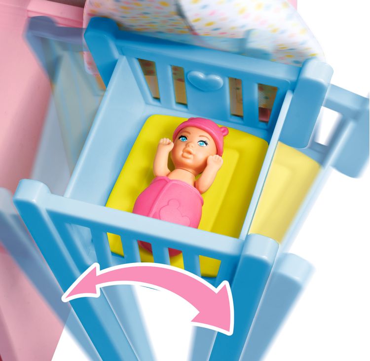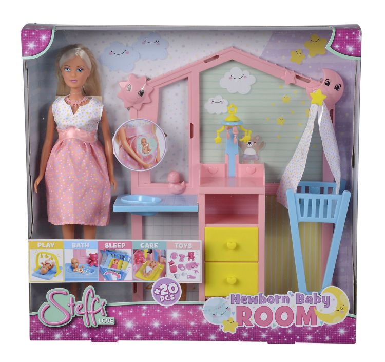 Steffi este insarcinata si pregateste camera bebelusului cu pat masa de infasat cada si alte accesorii 29cm. Camera bebelusului este complet utilata dupa bunul plac cu o masa de infasat cu cada asortata si un pat. Cu multe alte accesorii grozave Steffi LOVE Baby Room de la Simba Toys este potrivita pentru copiii de la 3 ani.Specificatii