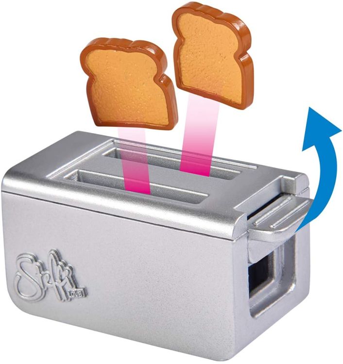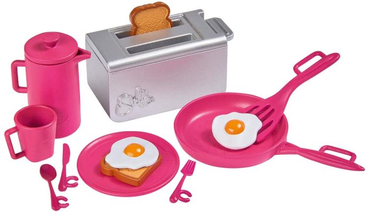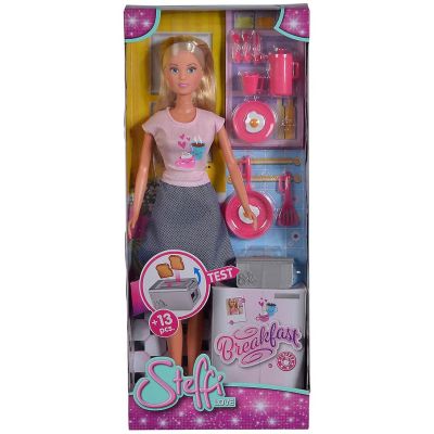 Steffi cu accesorii pentru micul dejun - Steffi adora sa ia micul dejun. Cu setul de 14 bucati, ea poate face oua prajite in tigaie si le poate servi pe farfurie. Desigur, nu trebuie sa lipseasca doua felii de paine prajita si cafea. Toster cu functie - daca puneti cele doua felii de paine prajita in sloturile prajitorului de paine si impingeti maneta in sus, painea prajita zboara din prajitor de paine ca si cum ar fi reala. Continutul setului - setul include o papusa Steffi LOVE intr-o rochie casual, precum si un prajitor de paine cu doua felii de paine prajita, o tigaie cu o spatula, un ulcior, o ceasca si tacamuri.