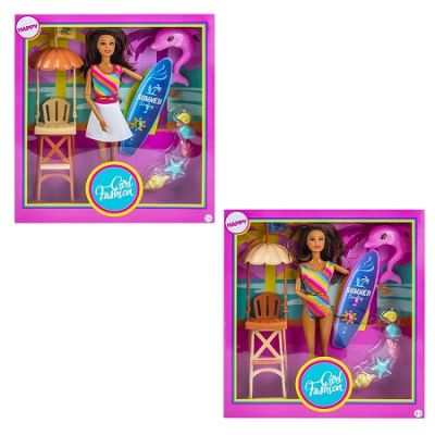 Iata o papusa frumoasa ce va incanta fetitele Jucaria incurajeaza jocurile de rol stimuleaza motricitatea indemanarea si imaginatia copiilor Caracteristici - Jucaria contine 1 x papusa 1 x scaun cu umbrela 1 x placa de surf 1 x delfin 1 x stea de mare 2 x scoici 2 x melci. - Papusa are tinuta de plaja. - Fetitele pot imbraca usor papusa deoarece imbracamintea are scai pentru prindere. - Jucaria este realizata din material plastic si textil nu dauneaza sanatatii non-toxic. - Pe langa faptul ca este grozav si distractiv jocul cu acest produs este o modalitate excelenta de a dezvolta creativitatea imaginatia si dexteritatea. Avertizare Produsul este nou si comercializat in ambalajul original al producatorului. Imaginile de pe acest site au caracter informativ. Ambalajul trebuie indepartat recuperat si aruncat de catre un adult inainte de a se da spre utilizare copilului. Nu lasati ambalajele produselor la indemana copiilor. Se recomanda utilizarea produsului sub supravegherea unui adult. Produsul poate contine piese mici care se pot inghiti sau inhala de cei mici existand pericolul de sufocare sau nu este potrivita copiilor mai mici de 3 ani. Pastrati instructiunile si etichetele pentru referinte viitoare. Pastrati produsul departe de foc si nu il lasati in preajma temperaturilor ridicate. Datorita masurarii manuale a produsului poate exista o diferenta minora fata de dimensiunea reala a produsului. Nerecomandat copiilor cu varsta mai mica de 3 ani.Specificatii