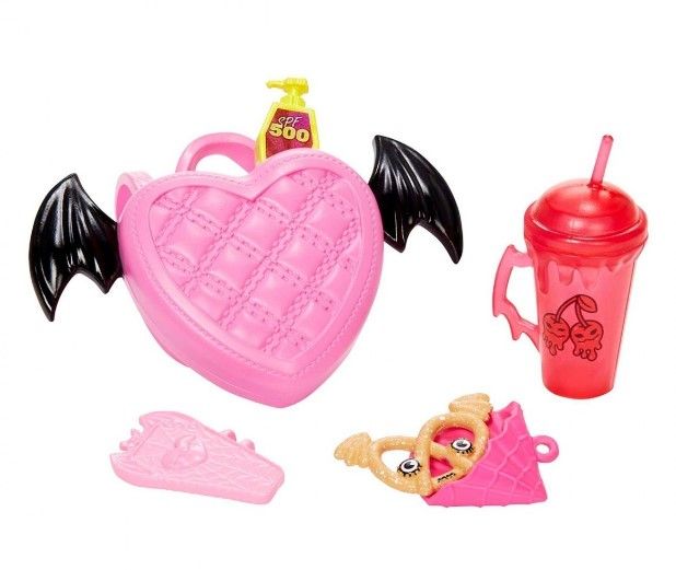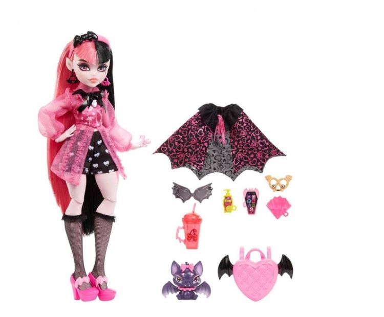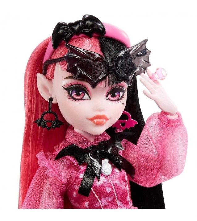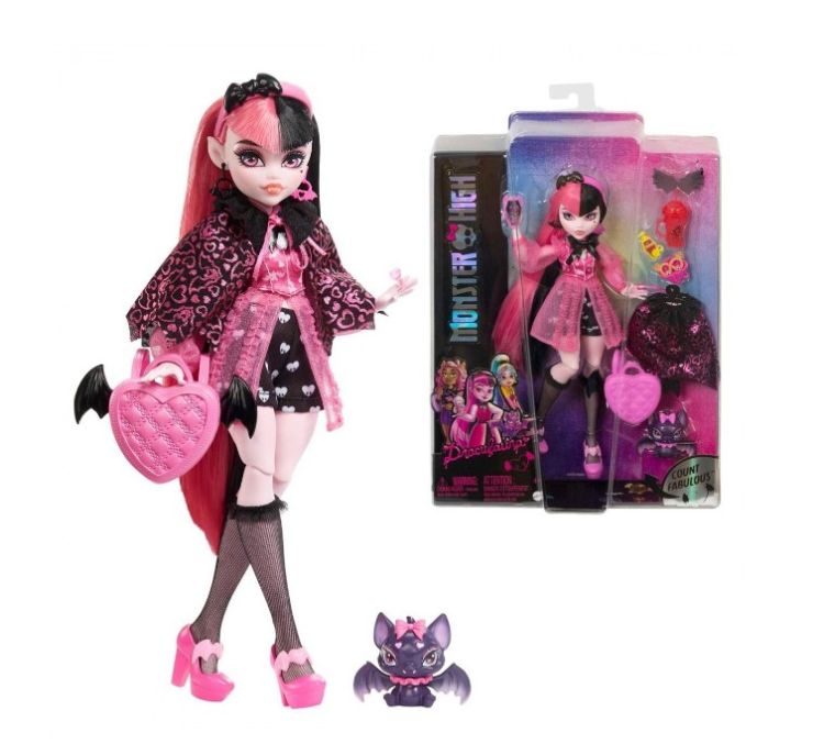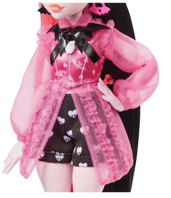 A reinceput scoala iar papusile Monster High apar intr-un stil grozav Papusa Draculaura se plimba pe holurile Monster High intr-o tinuta fantezista cu pantaloni scurti cu imprimeu cu inimioare si un corset cu maneci transparente. Look-ul ei infiorator inspirat de vampiri este completat de ciorapi transparenti cu volane pantofi roz cu platforma precum si o bentita si ochelari de soare cu detalii de liliac. Duceti look-ul papusii Draculaura la urmatorul nivel cu o pelerina de vampir infricosatoare si accesorii. Si inspira povestiri infioratoare cu liliacul ei de companie Count Fabulous Papusa nu poate sta singura.Specificatii