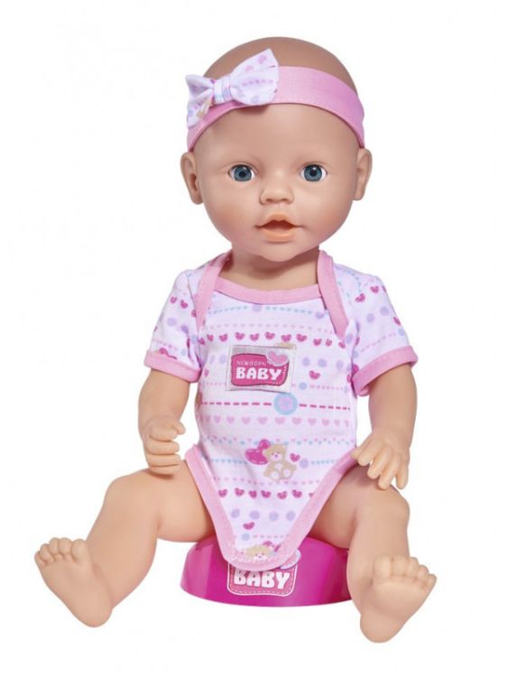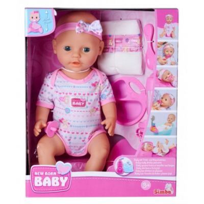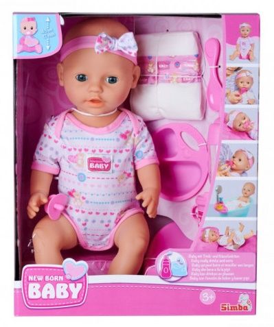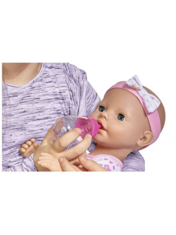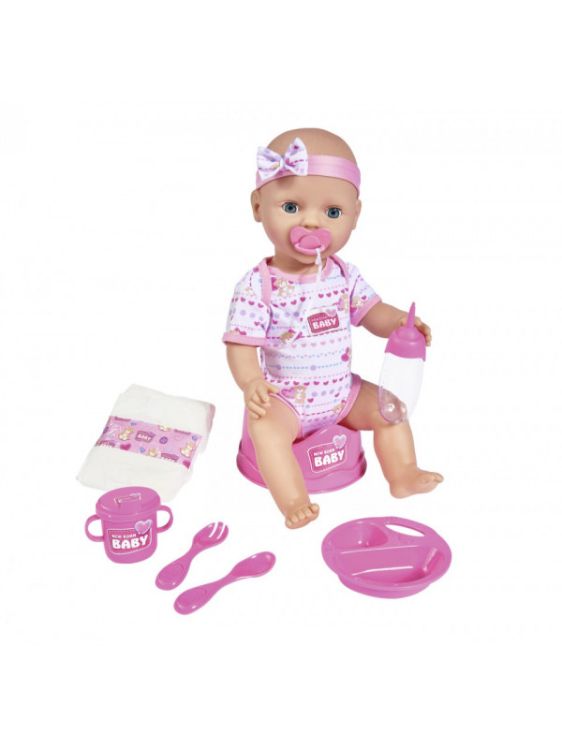 Setul include tot ce este necesar pentru ingrijirea papusii. Poti s-o hranesti sa-i dai o suzeta sa-i schimbi scutecul si s-o pui pe olita. Papusa este imbracata in salopeta are o banderola cu o fundita. Papusa poate bea si face pipi pe olita. Inaltime 43 cm. Setul include papusa sticla biberon ceasca castron lingurita furculita scutecSpecificatii