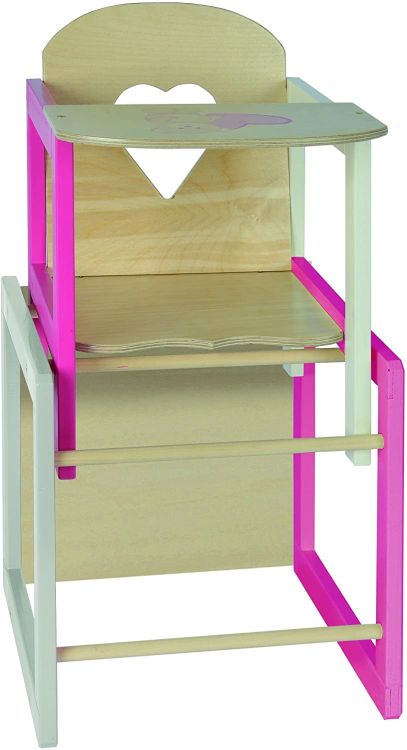 Scaunel inalt pentru papusi, construit din lemn, potrivit pentru papusi cu inaltimea intre 35 si 49 cm. Dimensiuni montat: 30x30x57cm.