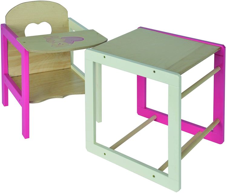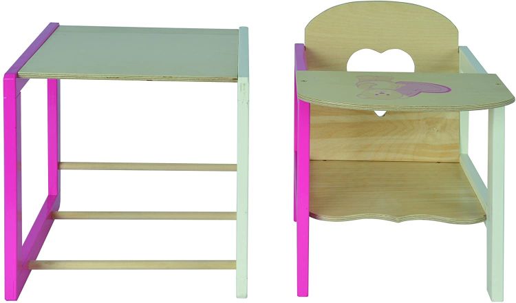 Cei mici se pot juca cu scaunul inalt al papusii conectat impreuna cu masa, dar si il pot demonta cu o optiune de conectare foarte usoara si il pot transforma intr-un scaun si masa separate si se pot juca cu el.