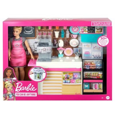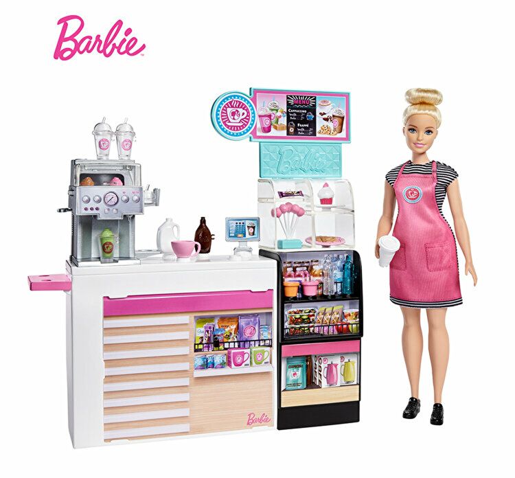 Exploreaza lumea distractiei cu setul de joaca Barbie Cafeneaua. Barbie poarta o rochie foarte draguta in dungi alb-negru si un sort roz, si este mereu pregatita sa serveasca clientii cu smoothie, cafea sau alte gustari delicioase. Acest set de joaca are foarte multe accesorii cum ar fi: un ulcior de lapte, sirop de ciocolata, cani de cafea, pahare de smoothie, o ceasca de ceai si multe altele. Cafeneaua mai are si sectiunea de gustari dulci, cu placinte, un tort si prajituri; o sectiune rece care contine diverse bauturi racoritoare si o sectiune de alte gustari. Cand un client si-a facut selectia si comanda este gata, papusa Barbie ii poate anunta sonor sa se indrepte catre casa de marcat.