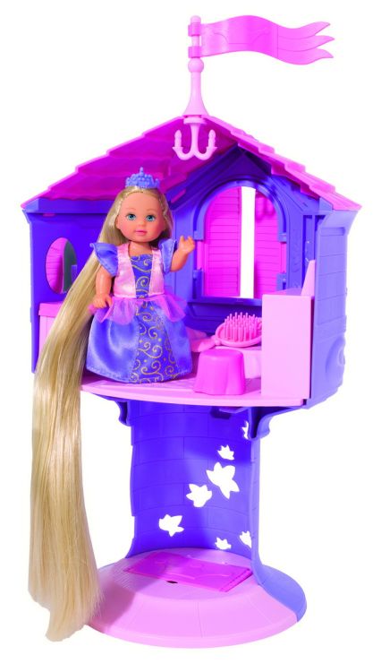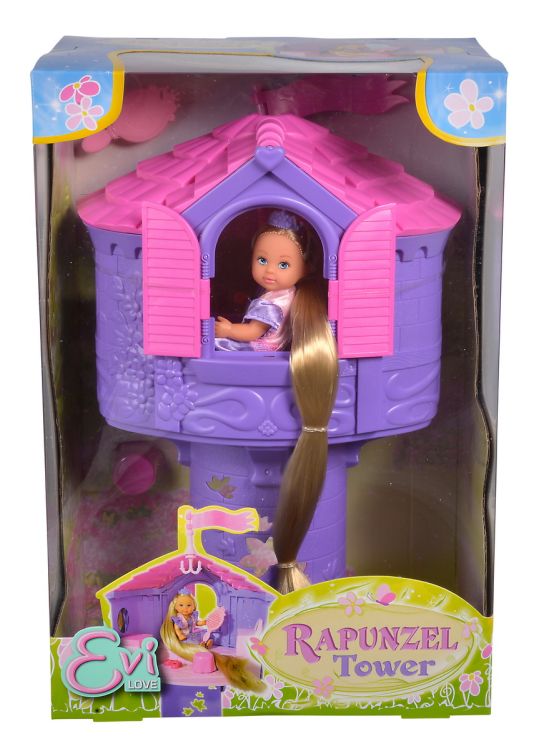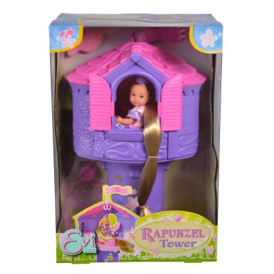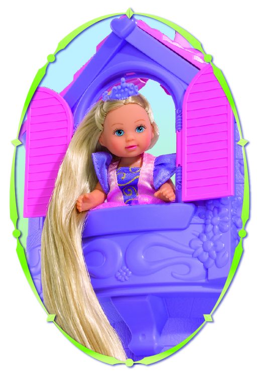 Papusa Evi Love este sora mica si dulce a lui Steffi LOVE. La fel ca Steffi are un par lung si lung nenumarate hobby-uri iubeste animalele si este perfect imbracata pentru orice ocazie. Fetele isi pot stiliza si imbraca papusa in tendintele actuale ale modei. Evi ca o printesa de basm - Evi incanta intr-o frumoasa rochie de printesa mov cu par blond extra lung si coroana mov. Peria mica poate fi folosita pentru coafarea parului. Rapunzel Tower - Turnul mov are 32 cm inaltime si are o platforma cu masa de toaleta pentru deschidere. De la fereastra se poate bucura de vedere sau isi poate lasa parul pe podea. La baza turnului exista un compartiment secret in care peria poate fi depozitata. O mare varietate de teme - gama Evi Love include multe categorii diferite cum ar fi moda basmele animalele calul si lumile vii. Datorita varietatii temelor fetele se pot cufunda mereu in roluri noi si le pot reda din nou.Specificatii
