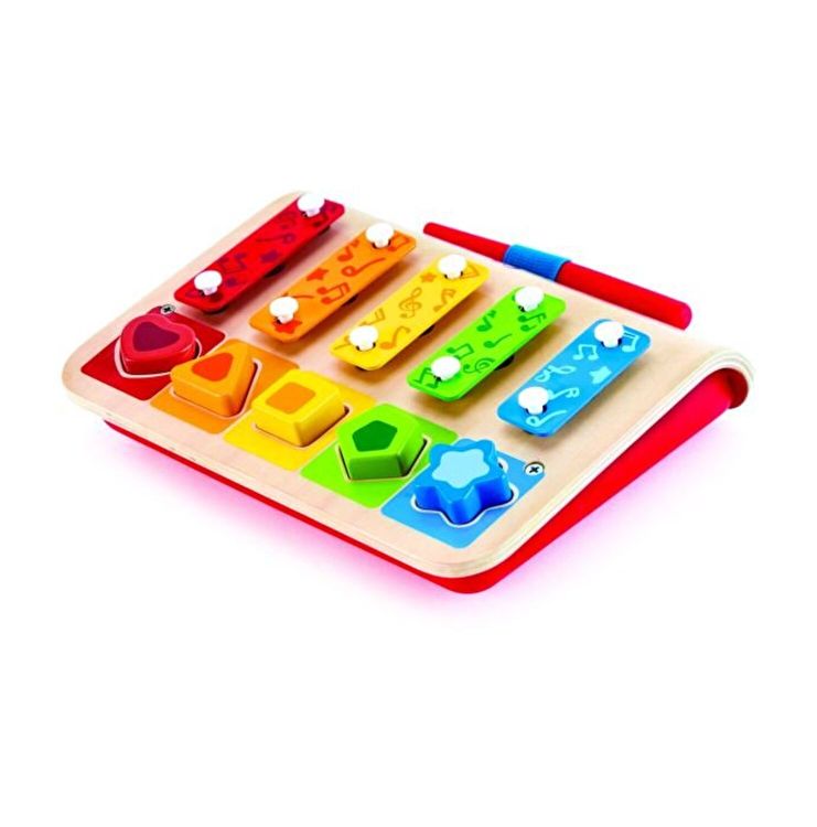 Este un pian sau un puzzle? Ei bine, Xilofonul multifunctional Shape Sorter este un joc de sortare a pianului, xilofonului si a formelor, toate intr-un singur joc! Potriveste piesele puzzle-ului cu gaurile corespunzatoare, fie prin forma, fie prin culoare si fa muzica minunata, fie apasand piesele puzzle-ului, fie lovind barele metalice cu bagheta inclusa! Xilofonul Shape Sorter include cinci piese de puzzle din lemn, un bagheta si o baza de xilofon / pian. Piesele de puzzle din lemn incluse pot fi montate in gaurile corespunzatoare si potrivite fie cu forma, fie cu culoare. Apasati blocurile sau atingeti piesele colorate cu bagheta rosie pentru a produce melodia Do, Re, Mi, Fa, So si redati un cantec folosind doar cinci note.