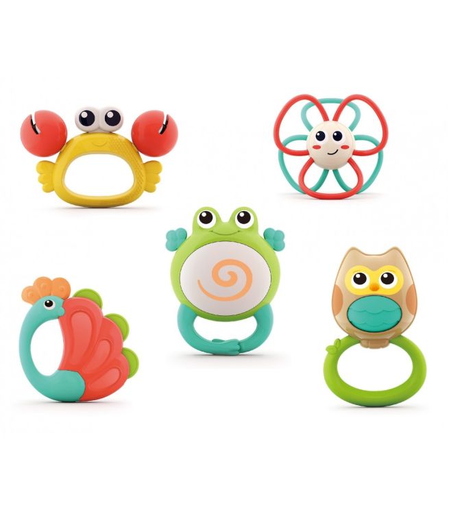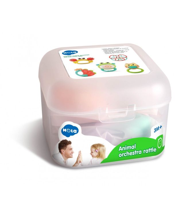 Jucariile bebe Hola Toys sunt produse special pentru dezvoltarea din primele luni ale bebelusului. Formele speciale si culorile vii incurajeaza copilul sa exerseze si sa se joace stimuland astfel dezvoltarea individuala. Nu contine bpa. Este confectionata din materiale sigure si durabile. Acest set include 5 jucarii zornaitori avand forma de animalute.
