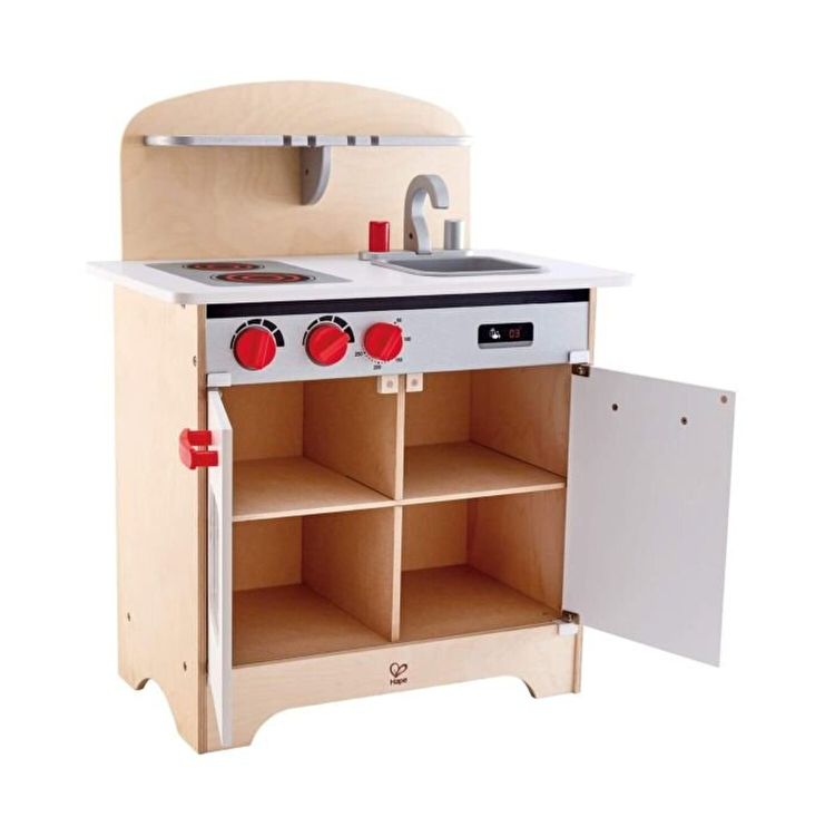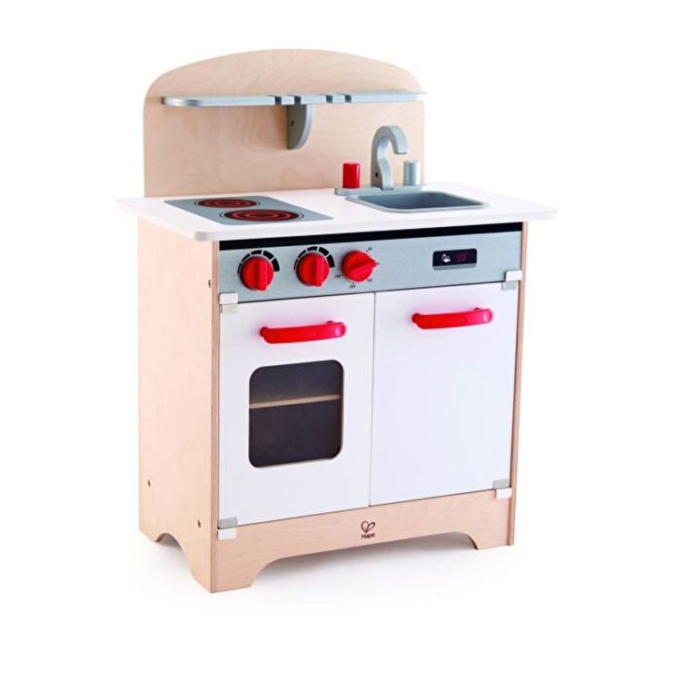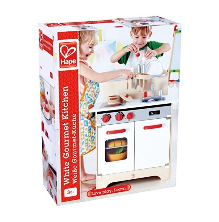 Set bucatarie, cu butoanele rotative, frigider cu raft, cuptor cu fereastra, robinet de apa si chiuveta, are tot ce aveti nevoie pentru a pregati o masa delicioasa. Bucataria White Gourmet este dotata cu blat de bucatarie cu raft si doua plite cu butoane reglabile, chiuveta cu doua butoane reglabile pentru apa calda si rece, frigider, dulap cu raft si cuptor cu fereastra si raft. Plitele includ butoane reglabile care fac clicuri realiste atunci cand sunt rotite. Chiuveta bucatariei si robinetele reglabile la cald si la rece pot fi indepartate pentru curatare. Cuptorul include o fereastra in usa pentru observare. Frigiderul si cuptorul includ ambele un raft.