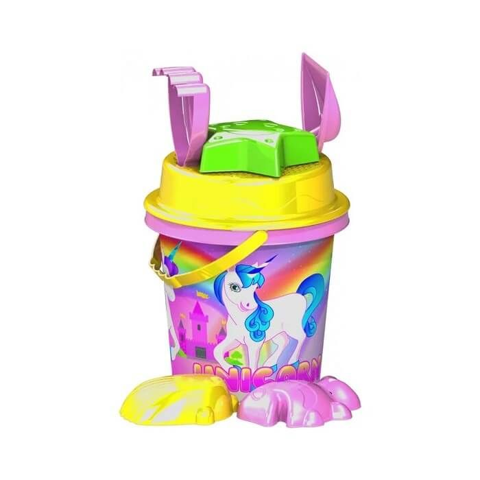Aceasta jucarie este perfecta pentru zilele de vara si nu numai cand copiii se joaca cu nisipul si fac forme distractive sau constructii grozave din acesta ceea ce ii va tine ocupati ore intregi. Oferiti-i copilului dumneavoastra instrumentele de care are nevoie pentru a-si dezvolta creativitatea chiar si la plaja Caracteristici - Jucaria include 1 galetusa 1 sita 1 lopata 1 grebla si 3 forme de modelaj. - Galetusa are maner ergonomic baza rotunda iar pe partile laterale o frumoasa imagine cu unicorni. - Setul include 3 forme de modelaj in care copiii pot pune cu lopatica nisip sau zapada avand un joc distractiv. Formele de modelaj pot diferi de la un set la altul iar livrarea este aleatorie. - Sita poate fi asezata ca si capac pe galetusa. Ea are 2 decupaje prin care se pot introduce manerele greblei si lopetii. - Copiii se pot juca cu nisip vara pe plaja in gradina sau in curte iar iarna cu zapada. Galetusa este excelenta si pentru a transporta jucarii blocuri de constructie si alte articole. - Jucaria este fabricata din material plastic de inalta calitate durabil si sigur. - Rezistenta la intemperii jucaria permite jocul in orice perioada a anului. - Jucaria dezvolta dexteritatea coordonarea si indemanarea. In acelasi timp copiii invata notiuni despre culori si forme. - Ambalaj plasa. Dimensiune galetusa 19x17x16. 5 cm Dimensiune sita 17. 5x17. 5x6 cm Dimensiune grebla 19x10x2 5 cm Dimensiune lopata 19x8. 5x3. 5 cm Dimensiune forme scoica 11. 5x9. 5x3 - 11x10. 5x2. 7 cm pestisor - 12x9. 5x2. 4 cm testoasa- 11. 5x8x2. 7 cm formele de modelaj pot diferi de la un set la altul dimensiunea este exemplificativa Avertizare Produsul este nou si comercializat in ambalajul original al producatorului. Imaginile de pe acest site au caracter informativ. Ambalajul trebuie indepartat recuperat si aruncat de catre un adult inainte de a se da spre utilizare copilului. Nu lasati ambalajele produselor la indemana copiilor. Se recomanda utilizarea produsului sub supravegherea unui adult. Produsul poate contine piese mici care se pot inghiti sau inhala de cei mici existand pericolul de sufocare sau nu este potrivita copiilor mai mici de 1 an. Pastrati instructiunile si etichetele pentru referinte viitoare. Pastrati produsul departe de foc si nu il lasati in preajma temperaturilor ridicate si a umiditatii. Datorita masurarii manuale a produsului poate exista o diferenta minora fata de dimensiunea reala a produsului.Specificatii