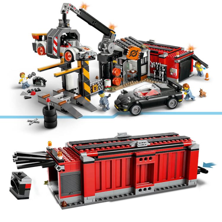 Ce este in cutie? – Aceasta jucarie LEGO® include tot ce au nevoie copiii pentru a construi un cimitir de fier vechi, cu o macara cu gheara, un concasor, o cladire de birouri, 2 masini si 4 minifigurine lucratori