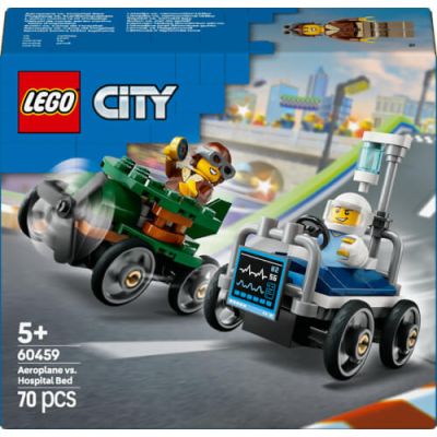 Incanta-ti micul fan al curselor cu LEGO® City Pachet de curse Avion vs. pat de spital (60459) pentru copii de 5 ani si mai mari. Aceasta jucarie distractiva include 2 vehicule de curse nemotorizate si 2 minifigurine. Copiii ii infrunta pe pilotul din avionul in zbor si pe pacientul de pe patul de spital surprinzator de rapid. Cine va castiga? Ocupa-ti locul si urmareste cursa urbana spectaculoasa!