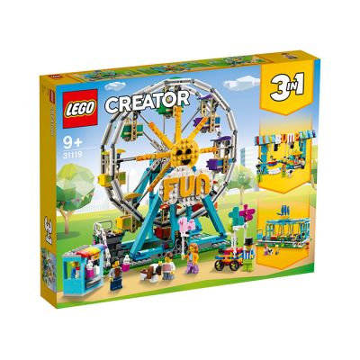 Seturile LEGO Creator 3 in 1 permit copiilor sa-si exploreze latura creativa cu 3 modele de construit in fiecare cutie! Posibilitatile de joaca nu se termina niciodata, deoarece fiecare model poate fi reconstruit in ceva nou ori de cat ori isi doresc copiii. Alege dintr-o gama uimitoare de seturi 3 in 1, inclusiv masini, animale si rachete spatiale.Vino si bucura-te de toata distractia din parcul de distractii! Ia loc in Roata si traieste experienta unei curse palpitante in cerc, in inaltul cerului! Ia niste floricele si un balon cand te intorci jos. Apoi reconstruieste-o intr-o masina cool de tamponari pentru distractie in curse, sau intr-un leagan barca pentru si mai multe senzatii tari. Bucura-te de iesirea suprema cu acest senzational set 3 in 1.
