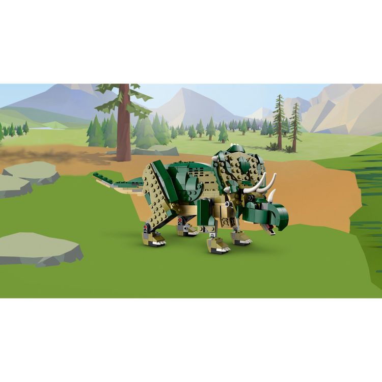 Baietii si fetele de 9 ani se pot intoarce in timp pentru a interpreta scene uimitoare de actiune cu jucaria cu dinozaur T. rex 31151 . Jucaria Tyrannosaurus rex este articulata astfel incat copiii ii pot misca capul picioarele coada maxilarul picioarele bratele si chiar degetele de la picioare si calcaiele creand diferite posturi. Setul include si un cuib care contine 2 elemente mici reprezentand oua de dinozaur. Impreuna dinozaurul si cuibul alcatuiesc un exponat impresionant pe un raft sau pe o noptiera. Acest set de constructie LEGO cu dinozauri ii transporta pe copii intr-o lume plina de posibilitati palpitante de joaca dandu-le ocazia sa construiasca 3 dinozauri diferiti cu aceleasi caramizi. Copiii pot crea un T. rex articulat pe care il pot reconstrui intr-un triceratops infricosator cu 3 coarne sau intr-un pterodactil cu aripi mari si mobile. Kiturile de constructie LEGO Creator 3 in 1 sunt cadouri grozave de zi de nastere sau de sarbatori oferind copiilor ocazia sa creeze 3 modele diferite in fiecare cutie. Seturile 3 in 1 ofera o gama de modele din caramizi care raspunde celor mai mari pasiuni ale celor mici incluzand vehiculele super rapide animalele uimitoare si scenele urbane detaliate. Atentie Contraindicat copiilor mai mici de 3 ani. Jucaria produsul poate contine piese mici care se pot inghiti sau inhala existand pericolul de sufocare. Nu lasati ambalajele jucariilor produselor la indemana copiilor. Indepartati orice ambalaj al jucariei produsului inainte de a da jucaria produsul copilului. Va rugam sa supravegheati copilul in timp ce se joaca foloseste acest produs. Pastrati instructiunile si etichetele pentru referinte viitoare. Pastrati jucaria produsul departe de foc feriti jucaria produsul de temperaturi ridicate si umiditate.Specificatii