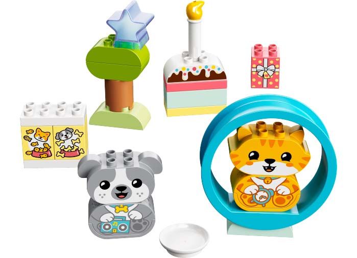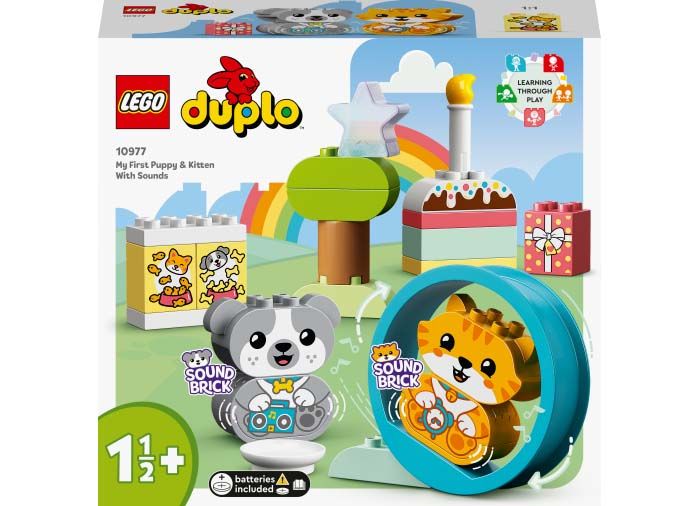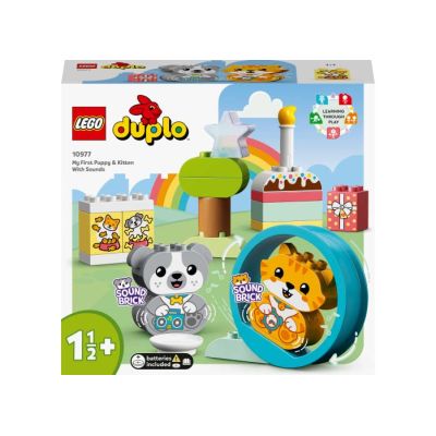 Copiii cu varste de la 18 luni in sus se pot distra invatand si dezvoltandu-si abilitatile cu setul LEGO DUPLO Primul meu catelus si pisicuta cu sunete (10977).