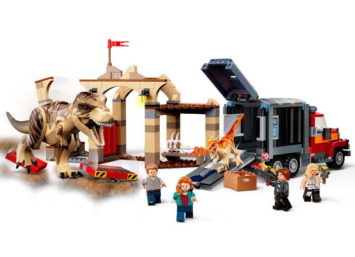 Construieste o piata cu un tarc pentru T-rex si un camion mare cu remorca si cusca pentru transportul Atrociraptorului. Apoi interpreteaza propriile tale povesti pasionante cu minifigurinele Owen Grady, Claire Dearing, Rainn Delacourt si Soyona Santos, plus 2 pistoale tranchilizante pentru a calma dinozaurii!