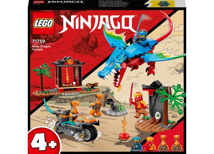 LEGO NINJAGO Templul Dragonului (71759) ajuta copiii de 4+ ani sa isi dezvolte abilitatile de constructie. Include un dragon articulat, 2 temple ninja, 2 copaci articulati, un ou de dragon si 4 minifigurine: ninja Kai si Nya si inamicii Cobra Mechanic si Sneaky Snake.