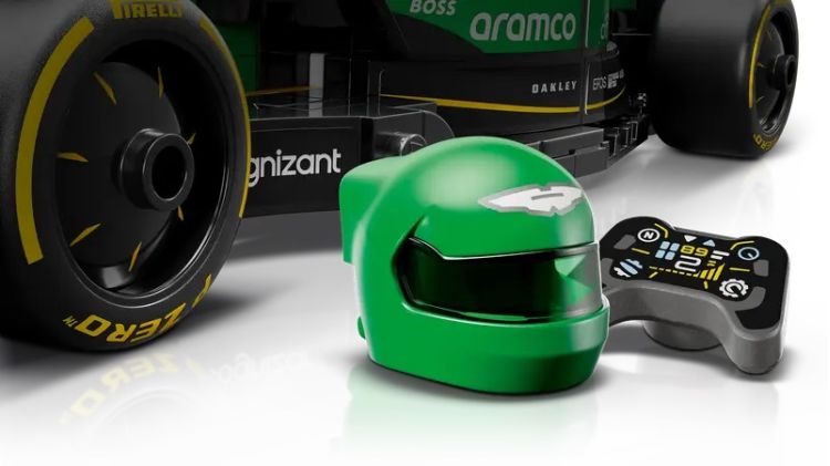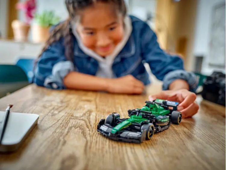 Masina de curse F1 Aston Martin Aramco are un cockpit care se deschide prin ridicarea barei de protectie Halo, o aripa spate, suspensie cu brat triunghiular, stickere ale sponsorilor si anvelope spate mai late, imprimate cu numele  Pirelli. Setul auto include si o minifigurina pilot purtand o tinuta Aston Martin Aramco F1 si o casca, pe care o poti plasa in interiorul cockpitului si cu care poti imagina curse.