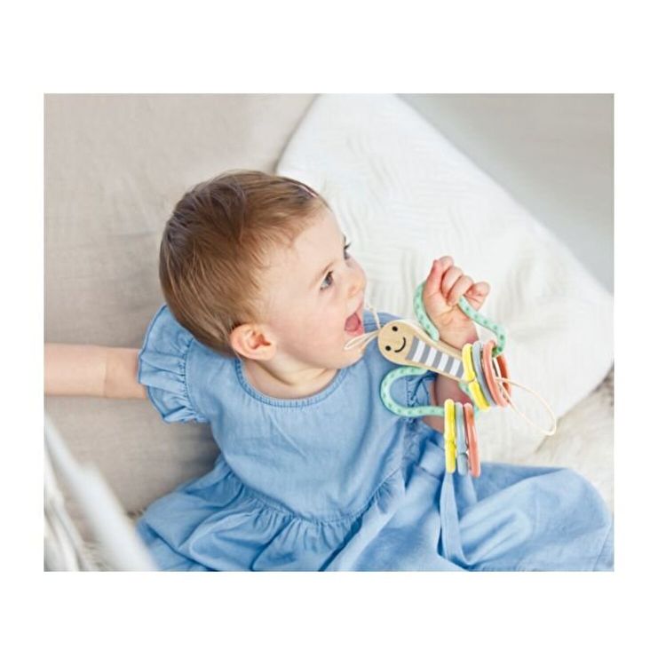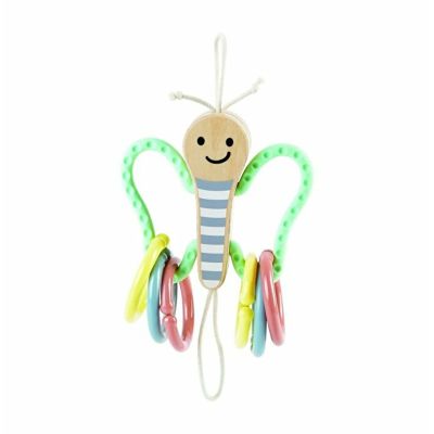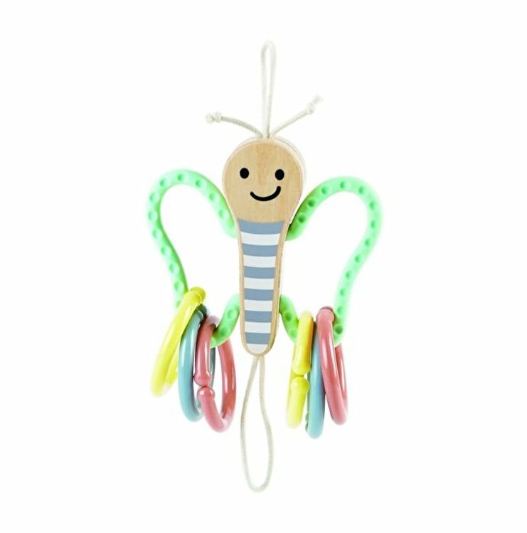 Acest fluture dragut este o modalitate distractiva pentru bebelusi de a se distra in timp ce isi practica prinderea si tinerea! Usor de atasat la un patut sau carucior, aripile fluturelui sunt fabricate din silicon si sunt 100% sigure de mestecat. Trei inele de plastic deschise.