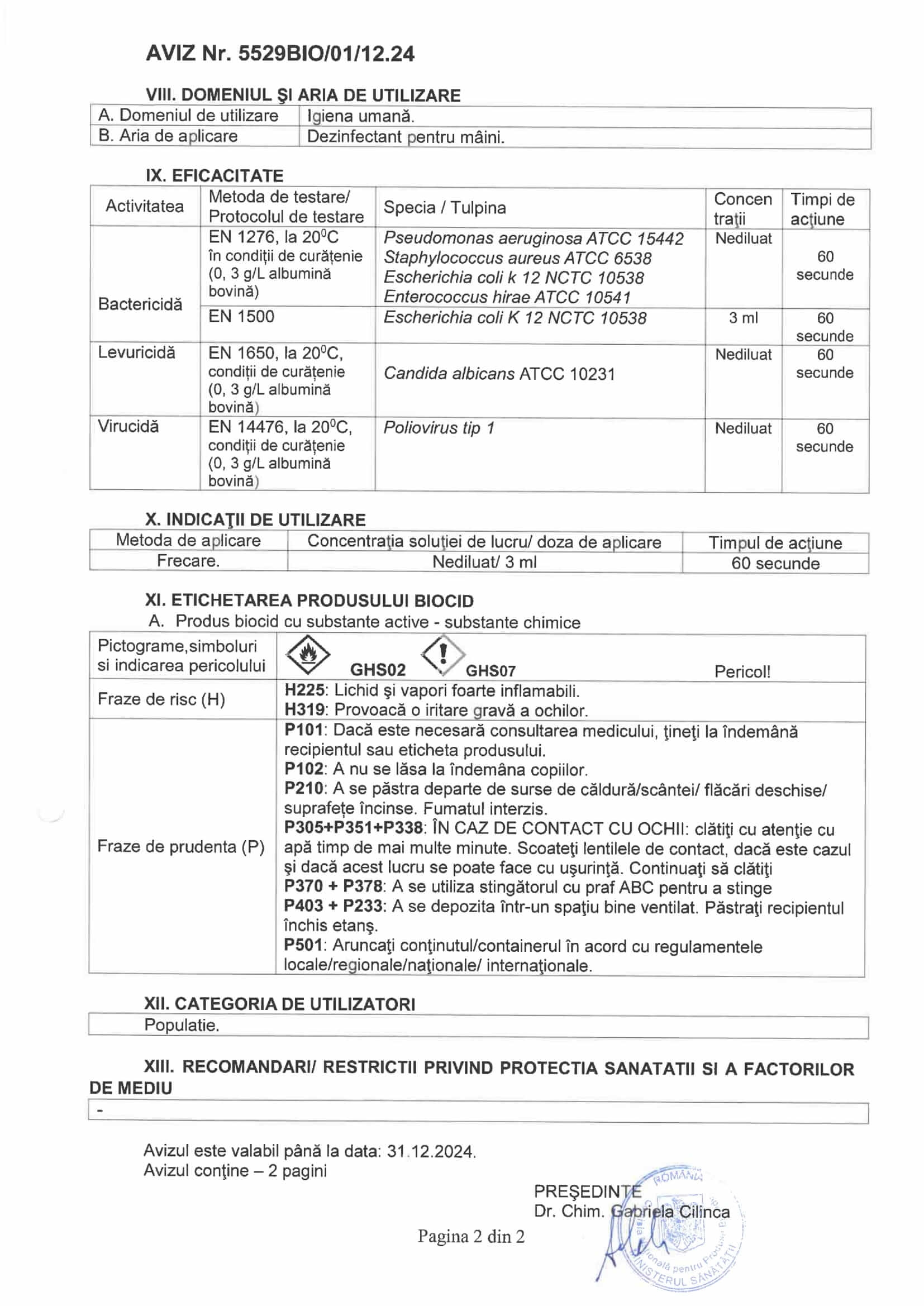 Tip de produs: 1 – Este un produs biocid destinat igienei umane. Solutie hidroalcoolica pentru dezinfectia igienica.