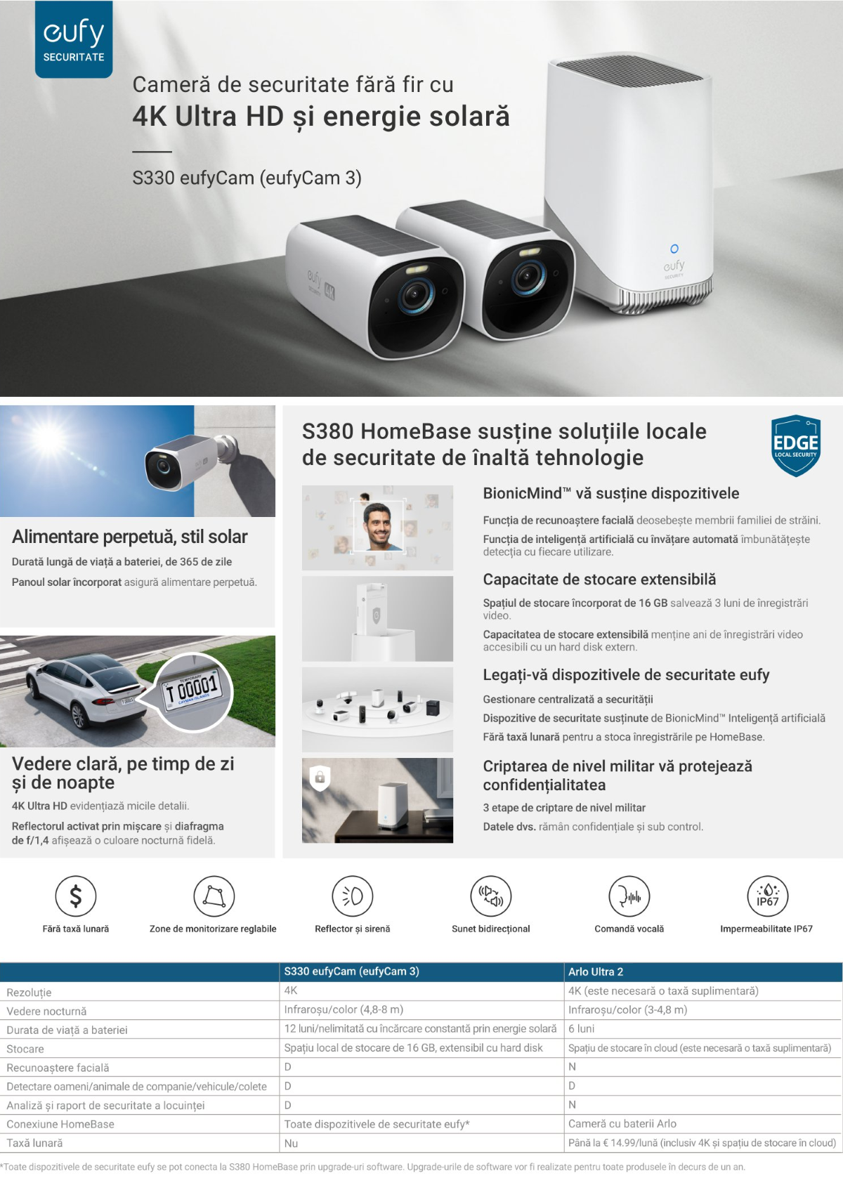 eufyCam 3 este autonoma in orice mediu de exterior, cu un panou solar integrat, avand nevoie doar de 2 ore de lumina solara pe zi pentru alimentare continua.