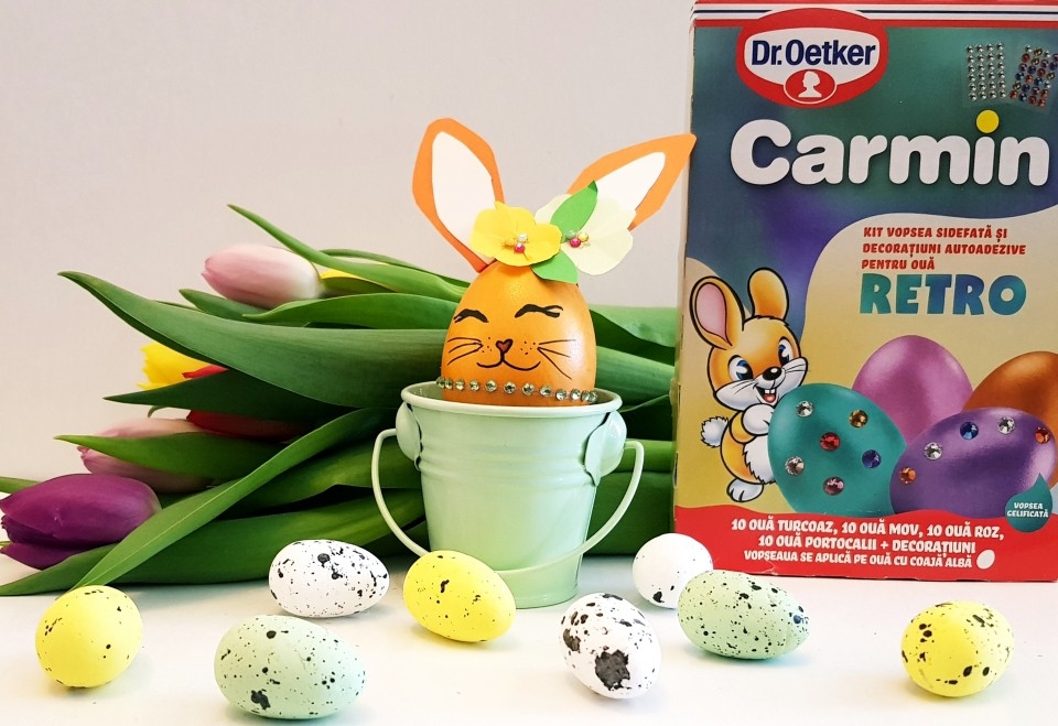 Kit pentru oua de Paste. Vopsea sidefata, patru culori, pentru 40 de oua si decoratiuni. Cutia contine: patru plicuri cu vopsea sidefata, o pereche de manusi de menaj, decoratiuni autoadezive. Vopseaua nu este toxica.