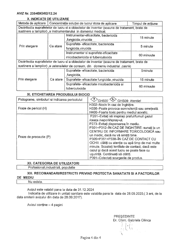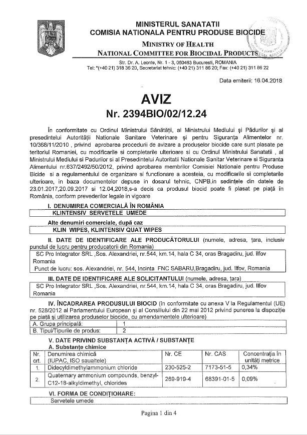 Aviz emis de COMISIA NATIONALA PENTRU PRODUSE BIOCIDE: