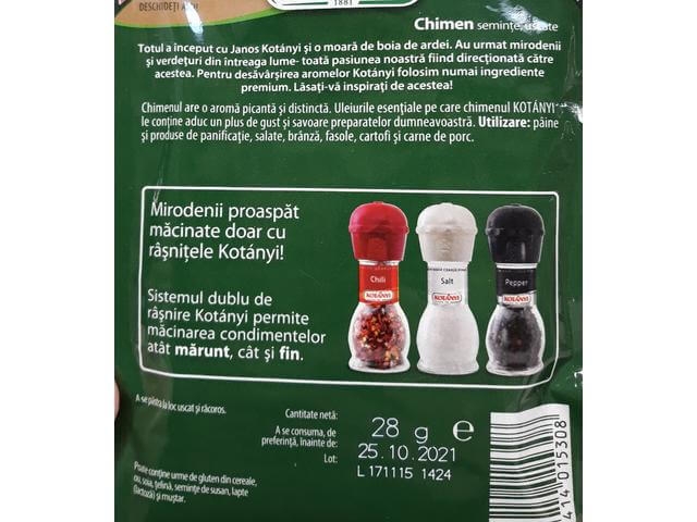 Totul a inceput in 1881 cu Janos Kotanyi si o moara de boia de ardei . Au urmat mirodenii si verdeturi din intreaga lume, toata pasiunea noastra fiind directionata catre acestea. Pentru desavarsirea aromelor Kotanyi folosim numai ingredient premium. Lasati-va inspirati de acestea! Chimenul seminte are o aroma picanta si distincta. Datorita ueliurilor esentiale pe care acesta le contine, chimenul seminte de la Kotanyi este ajutorul de nadejde in prepararea numeroaselor delicii culinare.