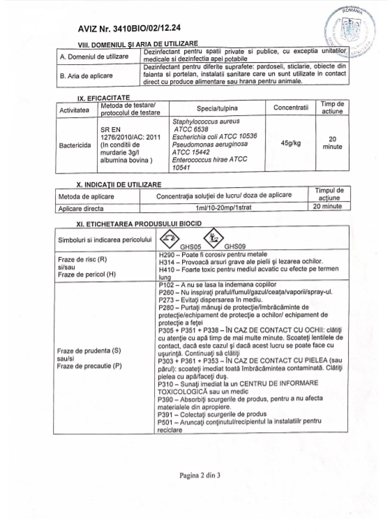 Compozitie: Amestec omogen pe baza de substante biocide active.