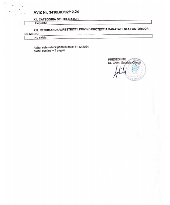 Utilizare: Prin aplicarea directa: 1 ml/ 20- 30 mp/strat. Produsele se recomanda pentru diferite suprafete (suprafete, obiecte de faianta, instalatii sanitare care nu sunt utilizate in contact direct cu producerea de alimente sau hrana pentru animale sau pentru inalbirea rufelor.