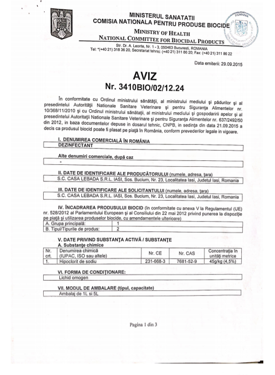 Lebada dezinfectant pe baza de clor profesional 5 L, avizat Ministerul Sanatatii