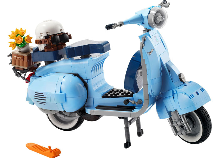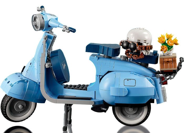 La fel ca originalul, acest model Vespa construibil are o roata din fata montata pe o parte, 2 locuri, un motor din caramizi cu un capac detasabil deasupra, un picior de sprijin functional, plus o directie functionala.�Elementele de finisaj includ sigla Vespa, un numar de inmatriculare italian clasic din anii 1960, o roata de rezerva, o casca, plus un cos de accesorii ce includ un buchet de flori in spate.