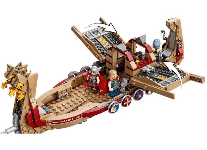 Barca este trasa pe cer de legendarele capre Toothgnasher si Toothgrinder, care sunt ridicate de jos astfel incat copiii pot impinge cu usurinta nava in timpul jocului. Setul include 5 minifigurine Thor, Puternicul Thor, Valkyrie, Korg si Gorr si o serie de arme si accesorii, inclusiv toporul Nimicitor de furtuni al lui Thor. Cabina centrala are un acoperis ce se deschide pentru a permite joaca in interior.