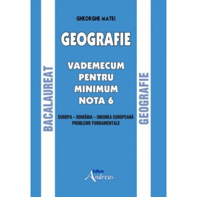 Examenul de Bacalaureat reprezint un moment important n procesul desav rsirii educationale si profesionale a fiecarui elev adolescent ncheind o etapa de mari acumulari de cunostinte stiintifice. Geografia studiata de catre elevii din clasele terminale ale ciclului liceal Europa-Rom nia-Uniunea Europeana. Probleme fundamentale este prezenta la examenul de bacalaureat printr-o proba scrisa compusa din trei subiecte c te unul pentru fiecare componenta din titlul disciplinei prin rezolvarea carora elevii trebuie sa demonstreze ca au dob ndit competentele prevazute n programa scolara n vigoare si n programa de examen. Geografie vademecum pentru minimum nota 6 si propune sa raspunda problemelor fundamentale cu care se confrunta lumea de azi Rom nia n special n cadrul continentului din care face parte Europa si n cadrul uniunii politice si economice formata din 27 de state membre Uniunea Europeana. Care sunt particularitatile acestui vademecum abordarea liniara inedita a continuturilor care urmaresc ndeaproape structura subiectelor probei de examen esentializarea continuturilor sub forma unor harti si tabele sinoptice memorarea vizuala si logica a informatiilor din harti statele si orasele-capitala din Europa r uri si orase din Rom nia si tabele rezolvarea facila a comparatiilor de clima ntre doua state europene si de relief ntre doua unitati subunitati de relief din tara noastra ntr-un mod inedit si eficient prezenta la finalul lucrarii a c torva exemple pentru rezolvarea unor calcule din Subiectul al III-lea a unor it mi grupati sub denumirea de Exercitii si a doua teste de antrenament pentru validarea demersului teoretic si practic propus aici. Lucrarea de fata de Gheorghe Matei Geografie vademecum pentru minimum nota 6 completeaza pachetul educational compus din Geografie ghid de pregatire pentru bacalaureat si Geografie caiet cu fise de lucru si teste pentru bacalaureat aparute n 2020 asigur nd tuturor elevilor o pregatire completa la Geografie pentru obtinerea unui punctaj c t mai mare. Continuturi sistematizate Suport cartografic 60 de harti Indrumar 25 de teste si bareme de evaluare Mic dictionar ilustrat de termeni geografici 50 de fise de lucru 10 teste si bareme de evaluareSpecificatii