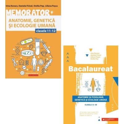 Bacalaureat Biologie - Anatomie si fiziologie genetica si ecologie umana clasele 11-12 - Liliana Pasca Bacalaureat. Anatomie si fiziologie genetica si ecologie umana clasele XI XII este ghidul perfect de pregatire pentru sustinerea probei a examenului de bacalaureat fiind elaborat de unul dintre cei mai remarcabili profesori de biologie din tara. Lucrarea de fata cuprinde Programa disciplinei Anatomie si fiziologie genetica si ecologie umana 45 de teste dupa modelul M. E. N. care parcurg toate temele din programa Bareme de evaluare si notare si sugestii de raspuns astfel incat volumul poate fi folosit cu succes in pregatirea iniduala a candidatilor. Memorator de Biologie anatomie genetica si ecologie umana pentru clasele 11-12 - Liliana Pasca Memoratorul de anatomie genetica si ecologie umana pentru clasele a XI-a si a XII-a se adreseaza elevilor din ciclul superior de liceu si in special celor care se pregatesc din materia de anatomie genetica si ecologie umana pentru sustinerea probei a examenului de bacalaureat. Volumul este bogat in informatie bine sistematizat si include ilustratii care insotesc explicatiile notiunilor mai dificile in sectiunea de genetica . Memoratorul respecta programele scolare pentru clasele a XI-a si a XII-a si pe cea de bacalaureat fiind un excelent material complementar pentru pregatirea examenului de maturitate impreuna cu volumul Bacalaureat. Anatomie si fiziologie genetica si ecologie umana clasele XI XII .Specificatii