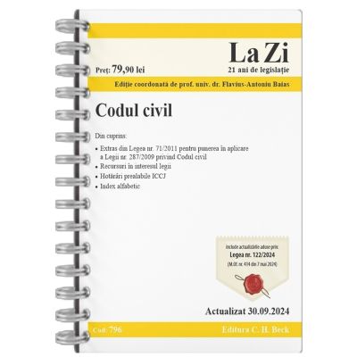Aparitia unei noi editii a lucrarii a fost determinata de pronuntarea numeroaselor decizii ale Inaltei Curti de Casatie si Justitie respectiv ale Curtii Constitutionale a Romaniei privind dispozitiile Codului civil de la inceputul anului 2024 de la ultima editie a culegerii cu scopul de a veni in intampinarea studentilor si practicienilor cu un material actualizat si facil de parcurs. Totodata ratiunea unei noi editii rezida in adoptarea urmatoarelor legi Legea nr. 116 2024 privind aprobarea Ordonantei de urgenta a Guvernului nr. 104 2022 pentru modificarea si completarea Legii nr. 17 2014 privind unele masuri de reglementare a vanzarii terenurilor agricole situate in extravilan si de modificare a Legii nr. 268 2001 privind privatizarea societatilor ce detin in administrare terenuri proprietate publica si privata a statului cu destinatie agricola si infiintarea Agentiei Domeniilor Statului precum si de completare a Legii nr. 287 2009 privind Codul civil M. Of. nr. 406 din 30 aprilie 2024 Legea nr. 122 2024 pentru introducerea modificarea sau completarea mentiunii privind transpunerea normelor Uniunii Europene in cuprinsul unor acte normative precum si pentru modificarea si completarea Legii nr. 302 2004 privind cooperarea judiciara internationala in materie penala si a Legii nr. 135 2010 privind Codul de procedura penala M. Of. nr. 414 din 7 mai 2024 . Din cuprins Codul civil Extras din Legea nr. 71 2011 incluzand dispozitii tranzitorii de punere in aplicare si finale Index alfabetic Puncte forte dispozitii de punere in aplicare si tranzitorii inserate direct sub articolele din Cod la care se refera recursurile in interesul legii si hotararile prealabile pronuntate de ICCJ istoricul actelor normative codul este tiparit pe hartie alba de calitate superioara in format A5 legat cu spira pentru o utilizare mai facila index alfabetic detaliat Recomandari Codul civil. Comentariu pe articole. Editia 3 Despre coordonator Flavius-Antoniu Baias este prof. univ. dr. in cadrul Facultatii de Drept Universitatea din Bucuresti si titular al cursurilor de Drept civil. Drepturile reale Drept civil. Teoria obligatiilor si Dreptul familiei. Este cadru didactic asociat al Colegiului juridic franco-roman Universitatea din Bucuresti si profesor invitat la mai multe universitati printre care Universitatea Paris I Pantheon - Sorbonne Universitatea din Poitiers Universitatea Bordeaux IV Montesquieu Universtitatea Sao Paulo Universitatea Louvain-La-Neuve Belgia.Specificatii