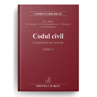 Lucrarea integrata in Colectia Comentarii are drept punct de plecare textul noului Cod civil si ofera practicianului informatia necesara pentru a-l putea intelege interpreta si aplica atat prin prisma explicatiilor teoretice cat si a trimiterilor la solutiile din practica judiciara. Structura comentariului vizand interpretarea textului si modul sau de aplicare este astfel conceputa incat sa prezinte o maxima utilitate pentru orientarea cititorului precum si pentru promovarea unor solutii corecte si coerente in plan legislativ si jurisprudential. Autorii sunt renumiti profesionisti reprezentand atat cadrul institutional propriu-zis cat si cel didactico-practic al sferei juridice. Efortul acestora reprezinta materializarea ideii de familiarizare a practicianului cu noile reglementari din domeniul dreptului civil privit in sens larg prin intermediul unui ghid in care pot fi gasite raspunsuri imediate clare si relevante. In aprilie 2012 aparea prima editie a lucrarii Noul Cod civil. Comentariu pe articole prima lucrare de acest gen si de aceasta anvergura din literatura juridica romana comentariul integral al Codului civil opera a 29 de autori si 4 coordonatori concretizata intr-un singur volum avand 2760 de pagini. Editia a treia intitulata acum Codul civil. Comentariu pe articole pentru ca la 10 ani de la intrarea sa in vigoare codul nu mai poate fi socotit nou valorifica analizele doctrinare substantiale si cele jurisprudentiale aparute intr-un deceniu de aplicare integrandu-le intr-un singur volum intreprindere unica inca in literatura juridica romaneasca despre care suntem convinsi ca isi va dovedi utilitatea pentru toti juristii acestei tari. Puncte forte comentariul integral al Codului civil ofera practicianului informatia necesara pentru a-l putea intelege interpreta si aplica structura comentariului vizeaza interpretarea textului si modul sau de aplicare promovarea unor solutii corecte si coerente in plan legislativ si jurisprudential scolile de drept importante din Romania reunite sub egida noului Cod civil ghid in care pot fi gasite raspunsuri imediate clare si relevante deciziile jurisprudentei in acele domenii de reglementare in care judecatorii au fost chemati sa aplice deja prevederile Codului civil autorii sunt renumiti profesionisti reprezentand atat cadrul institutional propriu-zis cat si cel didactico-practic al sferei juridice corelatii legislative sub fiecare articol din Cod tabel de corespondente index alfabetic bogat ALMASAN Adriana Prof. univ. dr. Universitatea din Bucuresti Facultatea de Drept Avocat BAIAS Flavius-Antoniu Prof. univ. dr. Universitatea din Bucuresti Facultatea de Drept BARLADEANU Ana Maria personal de specialitate juridica asimilat judecatorilor si procurorilor in cadrul Directiei Elaborare Acte Normative Ministerul Justitiei BOILA Lacrima Rodica Conf. univ. dr. Universitatea Petru Maior din Targu-Mures Avocat CALINESCU Irina Olivia Lect. univ. dr. Universitatea din Craiova Facultatea de Drept si Stiinte Sociale Judecator Judecatoria Dragasani CERCEL Sevastian Prof. univ. dr. Universitatea din Craiova Avocat CHELARU Eugen Prof. univ. dr. Decan al Facultatii de Stiinte Juridice si Administrative Universitatea din Pitesti Avocat CILTEA Valentin Doctorand Universitatea din Bucuresti Facultatea de Drept Avocat CONSTANTINOVICI Rodica Doctor in drept Avocat DOBRILA Mirela Carmen Asist. univ. dr. Universitatea Al. I. Cuza din Iasi Facultatea de Drept DOMINTE Nicoleta Rodica Lect. univ. dr. Universitatea Al. I. Cuza din Iasi Facultatea de Drept FLORIAN Emese Prof. univ. dr. Universitatea Babes-Bolyai din Cluj-Napoca Facultatea de Drept GHINOIU Decebal-Adrian Doctor in drept Consilier juridic Ministerul Justitiei IRIMIA Cristina Judecator detasat la Ministerul Justitiei MACOVEI Codrin Lect. univ. dr. Universitatea Al. I. Cuza din Iasi Facultatea de Drept Avocat MACOVEI Ioan Prof. univ. dr. Universitatea Al. I. Cuza din Iasi Facultatea de Drept Avocat MAGLAS Alexandru - Avocat MICLAUS-BADIN Maria-Nicoleta personal de specialitate juridica asimilat judecatorilor si procurorilor in cadrul Directiei Elaborare Acte Normative Ministerul Justitiei MOISE Alin-Adrian Doctor in drept Universitatea din Bucuresti Facultatea de Drept Notar public MUNTEANU Silviu Doctorand Universitatea din Bucuresti Facultatea de Drept Avocat NICOLESCU Cristina Mihaela Lect. univ. dr. Universitatea din Bucuresti Facultatea de Drept Consilier juridic Ministerul Justitiei PERJU Pavel fost Judecator la Inalta Curte de Casatie si Justitie si presedinte al Curtii de Apel Suceava PIPEREA Gheorghe Prof. univ. dr. Universitatea din Bucuresti Facultatea de Drept Avocat RADOI Alina Consilier juridic Director al Directiei elaborare acte normative Ministerul Justitiei STANESCU Andreea-Teodora Lect. univ. dr. Universitatea din Bucuresti Facultatea de Drept Avocat STANESCU Serban-Alexandru Lect. univ. dr. Universitatea din Bucuresti Facultatea de Drept Avocat STEFANESCU Anisoara Consilier juridic Ministerul Justitiei TERZEA Viorel Judecator Curtea de Apel Pitesti TRAILESCU Anton Prof. univ. dr. Universitatea de Vest din Timisoara Facultatea de Drept Avocat ULUITU Aurelian-Gabriel Conf. univ. dr. Universitatea Nicolae Titulescu din Bucuresti Facultatea de Drept Avocat UNGUREANU Diana Lect. univ. dr. Universitatea Crestina Dimitrie Cantemir din Bucuresti Facultatea de Stiinte Juridice si Administrative Judecator Curtea de Apel Pitesti VISINOIU Bogdan Asist. univ. dr. Universitatea din Bucuresti Facultatea de Drept Notar public ZAMSA Cristina Lect. univ. dr. Universitatea din Bucuresti Facultatea de Drept AvocatSpecificatii