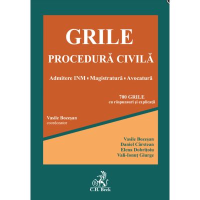 Lucrarea este realizata de catre coordonator-autor judecator formator INM impreuna cu trei absolventi ai Institutului National al Magistraturii prin care astfel se imbina experienta profesionala cu viziunea perspectiva adaptata la realitatea actuala a modului de testare a candidatilor la concursurile de admitere in profesii. Din cuprins peste 700 de grile din materia procedurii civile circumscrisa tematicii pentru concursurile de admitere in profesiile juridice in special INM magistratura avocatura grile de tip deschis cu unul sau doua raspunsuri corecte prin care se testeaza abilitatea cititorului de a sesiza diferentele si nuantele care determina in maniera decisiva varianta de raspuns corecta raspunsuri si explicatii detaliate privind rationamentul ce a stat la baza raspunsurilor cu indicarea punctuala si exacta a textelor legale incidente precum si a modului de interpretare a acestora din urma grile sistematizate pe institutiile de drept procesual civil astfel cum acestea sunt structurate in Codul de procedura civila. Puncte forte grile adaptate la noua modalitate de testare in cadrul examenelor de admitere din ultimii ani la INM magistratura avocatura grile cu grade variate de dificultate scazut-mediu-ridicat utile pentru orice stadiu de pregatire o metodologie inedita de realizare a grilelor in sensul ca acestea pot fi rezolvate prin raportare concreta la dispozitiile Codului de procedura civila explicatii detaliate ale tuturor raspunsurilor utile pentru intelegerea materiei si asimilarea de informatii grilele valorifica propria experienta a autorilor la examenul de admitere la INM dar si abilitatile acestora dobandite in cadrul institutului nuantele subtilitatile corelatiile si capcanele de interpretare pe care le ascund problemele juridice propuse prin grile provoaca cititorul si il ajuta in intelegerea adecvata a prevederilor Codului de procedura civila. Public-tinta Lucrarea este destinata atat candidatilor la concursurile examenele de admitere in profesiile juridice INM magistratura avocatura cat si studentilor in demersul acestora de intelegere si asimilare a informatiilor juridice privind procedura civila precum si in activitatea de verificare testare a cunostintelor din aceasta materie. Despre autori Vasile Bozesan este judecator la Tribunalul Ilfov iar in prezent formator INM catedra de Drept civil si drept procesual civil autor a numeroase lucrari si articole de specialitate juridica. Daniel Carstean Elena Dobritoiu si Vali-Ionut Giurge sunt judecatori stagiari proaspat absolventi ai Institutului National al Magistraturii cu rezultate deosebite in cadrul activitatilor specifice procedurii civile desfasurate in cadrul Institutului.Specificatii