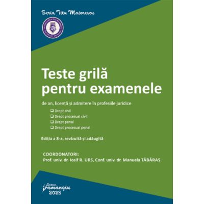 Cartea contine peste 1. 500 de teste grila din toate cele patru materii de studiu din care se dau atat examenele de licenta cat si examenele sau concursurile de admitere in magistratura avocatura sau notariat adica drept civil drept procesual civil drept penal drept procesual penal. In cadrul fiecarei discipline numarul grilelor este echilibrat pentru toate institutiile urmarindu-se cu prioritate ca testele elaborate sa se suprapuna cel putin partial tematicii de licenta pentru admiterea in Barou la Institutul National al Magistraturii sau la Institutul Notarial Roman. Toate grilele incluse in aceasta editie beneficiaza de explicatii ale variantelor de raspuns avand in acelasi timp marcat si nivelul de dificultate specific fiecarei grile. Au fost elaborate explicatii pentru toate variantele de raspuns nu doar pentru cele corecte pentru ca studentii sa inteleaga imediat si de ce o anumita varianta este gresita si sa gaseasca in cuprinsul acestei lucrari informatia cat mai completa fara a mai fi nevoiti sa apeleze la alte 2-3 carti in acelasi timp. Toate explicatiile grilelor sunt insotite de o legenda care indica gradul de dificultate al fiecarei grile atunci cand grila are in vedere un singur text de lege atunci cand rezolvarea grilei presupune coroborarea a doua texte de lege atunci cand rezolvarea grilei presupune coroborarea a trei sau mai multe texte de lege atunci cand nivelul de dificultate al grilei este unul ridicat D atunci cand pentru rezolvarea ei este necesara parcurgerea doctrinei de specialitate a RIL-urilor HP-urilor etc. S atunci cand grila este formulata sub forma unei spete. Dupa grilele asezate pe materii in partea finala a cartii au fost elaborate si doua teste recapitulative cu grile de nivel mediu spre dificil similare celor de la admiterile in profesie fiecare test incluzand 100 de intrebari cate 25 pentru fiecare disciplina de examen . Toate testele din editia a 8-a au fost revizuite si actualizate in acord cu tematica actuala de admitere in profesiile juridice incluzand modificarile legislative la zi cele mai importante fiind modificarile aduse prin Legea nr. 140 2022 privind unele masuri de ocrotire pentru persoanele cu dizabilitati intelectuale si psihosociale.