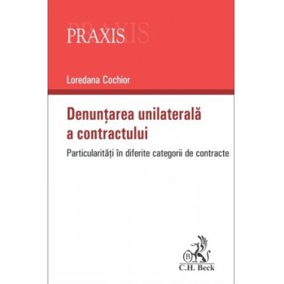 Denuntarea unilaterala a contractului prezinta o complexitate aparte fiind totodata o tema care nu a beneficiat de prea multa atentie in doctrina romaneasca in pofida faptului ca nu reprezinta o noutate in peisajul legislativ autohton. Sunt valorificate literatura de specialitate inclusiv cea franceza atat cu privire la aspectele generale privind denuntarea unilaterala a contractului cat si cu privire la particularitatile sale in cadrul anumitor contracte precum si jurisprudenta nationala respectiv europeana in vederea evidentierii aspectelor relevante pentru demersul stiintific. Lucrarea contureaza o perspectiva functionala asupra denuntarii unilaterale a contractului in general precum si asupra particularitatilor sale in anumite categorii de contracte astfel incat sa conduca la eficientizarea aplicarii practice a institutiei analizate si sa confere practicienilor un instrument adecvat complexitatii problemelor ivite in activitate reprezentand un sprijin si pentru teoreticienii masteranzii si doctoranzii interesati de subiectul analizat. Din cuprins Forta obligatorie a contractului Exercitarea dreptului de denuntare unilaterala Denuntarea unilaterala ca mijloc de protectie a consimtamantului Denuntarea unilaterala a contractelor din care deriva o putere speciala Denuntarea unilaterala a unor contracte civile speciale Retragerea din societatile comerciale Puncte forte analiza ampla a aspectelor ce tin de denuntarea unilaterala a contractului si specificitati in diferite categorii de contracte tratare pe larg a legislatiei si jurisprudentei incidente interpretari si clarificari doctrinare caracter interdisciplinar ample referinte bibliografice index detaliat Loredana COCHIOR este doctor in drept si notar public in cadrul Camerei Notarilor Publici Bucuresti.Specificatii