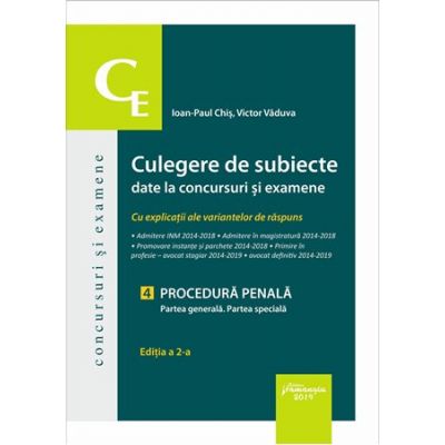 Culegere de subiecte date la concursuri si examene. 4 Procedura penala. Partea generala. Partea speciala cu explicatii ale variantelor de raspuns - Ioan-Paul Chis, Victor Vaduva
