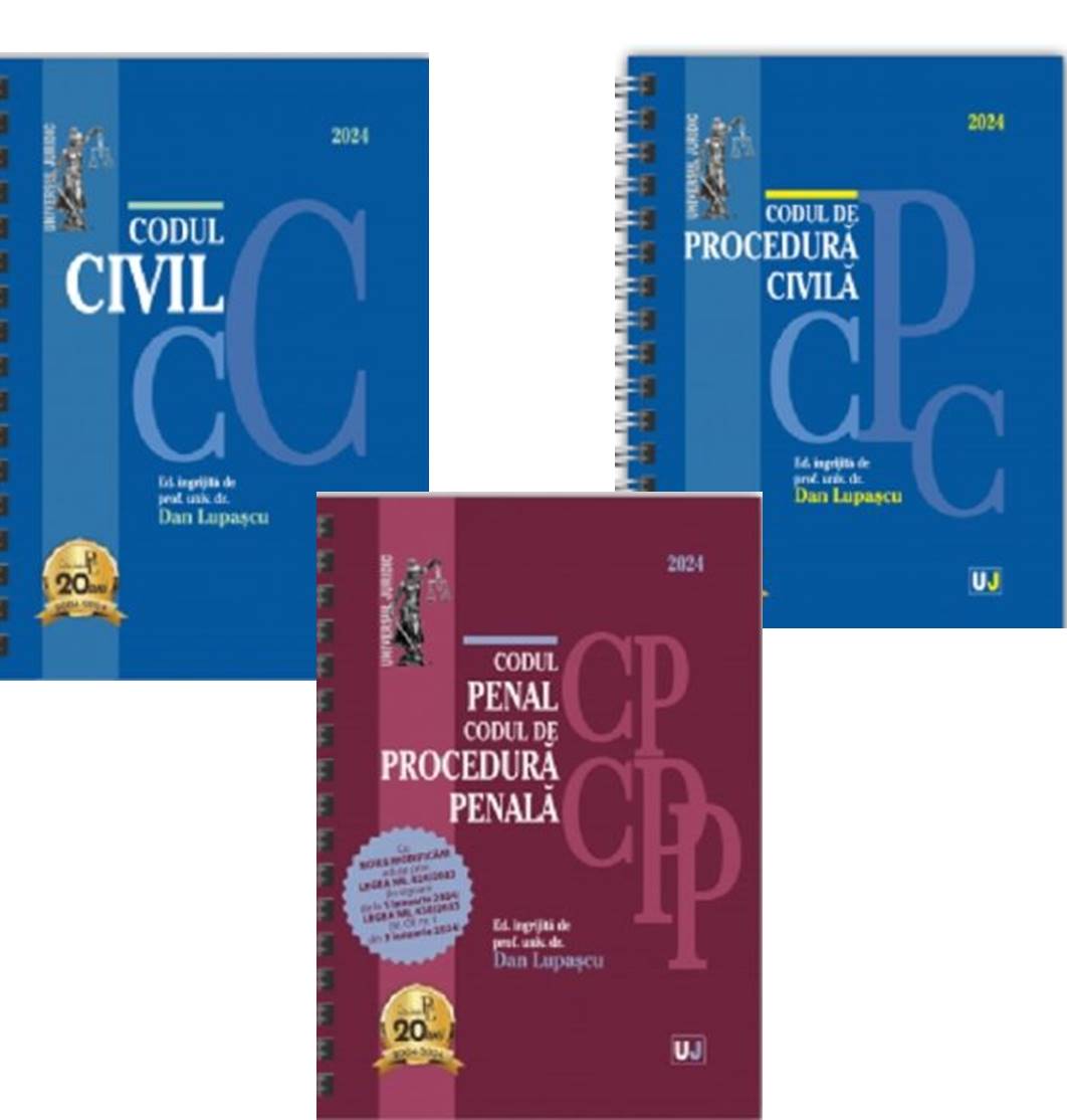Lucrarea Codul penal si Codul de procedura penala Ianuarie 2024 (editie spiralata), tiparita pe hartie alba de calitate superioara si ingrijita de prof. univ. dr. Dan Lupascu, cuprinde Codul penal si Codul de procedura penala, cu noile modificari aduse prin Legea nr. 424/2023 privind modificarea si completarea Legii nr. 217/2023 pentru modificarea si completarea Legii nr. 286/2009 privind Codul penal, a Legii nr. 135/2010 privind Codul de procedura penala, precum si a Legii audiovizualului nr. 504/2002 (M. Of. nr. 1194 din 29 decembrie 2023; in vigoare de la 1 ianuarie 2024) si prin Legea nr. 430/2023 pentru completarea art. 299 din Legea nr. 286/2009 privind Codul penal (M. Of. nr. 1 din 3 ianuarie 2024).
