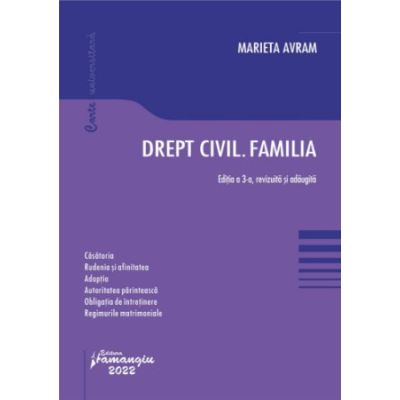 Lucrarea Drept civil. Familia se centreaza pe dispozitiile Codului civil cuprinse in Cartea a II-a Despre familie materia fiind actualizata cu modificarile legislative intervenite pana in luna iunie 2022 inclusiv Legea nr. 191 2022 pentru modificarea si completarea Legii nr. 272 2004 privind protectia si promovarea drepturilor copilului si Legea nr. 140 2022 privind unele masuri de ocrotire pentru persoanele cu dizabilitati intelectuale si psihosociale . Daca primele doua editii au avut ca obiectiv principal explicarea reglementarilor din Codul civil pentru a facilita asimilarea lor in practica aceasta noua editie aprofundeaza institutiile juridice din perspectiva numeroaselor acumulari legislative doctrinare si jurisprudentiale care s-au produs dupa mai bine de 10 ani de la intrarea in vigoare a Codului civil. Cartea Drept civil. Familia beneficiaza si de o noua structura prima parte este dedicata familiei ca uniune de persoane iar partea a doua trateaza regimurile patrimoniale respectiv regimurile matrimoniale specifice casatoriei si raporturile patrimoniale in cadrul parteneriatului neinregistrat uniune de fapt concubinaj . Pentru ca istoria dreptului familiei este istoria ideilor pe care oamenii le au despre familie lucrarea ofera si un tablou succint al familiei traditionale care sa permita intelegerea contrastelor si a dinamicii familiei contemporane puternic marcata de dreptul european al drepturilor omului si de dreptul Uniunii Europene. Sunt abordate atat teme clasice care ar necesita o reformare de exemplu adoptia majorului cat si teme noi precum dreptul la casatorie si la viata de familie in cazul persoanelor cu dizabilitati intelectuale si psihosociale din perspectiva modificarii Codului civil. O atentie speciala este acordata autoritatii parintesti avand in vedere ca cea mai consistenta parte a litigiilor de familie graviteaza in jurul raporturilor dintre parinti si copii in cazul separatiei parintilor care isi disputa uneori dramatic locuinta copilului si programul de relatii personale. De asemenea sunt analizate aspecte sensibile legate de executarea titlurilor referitoare la minori din perspectiva dreptului national si a jurisprudentei europene. Lucrarea Drept civil. Familia se adreseaza deopotriva studentilor si practicienilor magistrati notari avocati executori judecatoresti mediatori care vor putea regasi facil informatia esentiala dar si discutii aprofundate cu privire la unele probleme actuale controversate in doctrina si in jurisprudenta. Dr. Marieta AVRAM este profesor universitar la Facultatea de Drept a Universitatii din Bucuresti fiind titular al cursurilor de Dreptul familiei si regimuri matrimoniale si avocat in Baroul Bucuresti. A facut parte din Comisia de redactare a Proiectului noului Cod civil.Specificatii