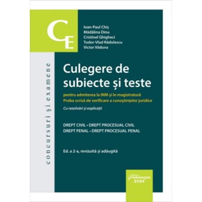 Daca va numarati printre cei care ati trecut ori sunteti increzatori ca veti trece de bariera testului grila a concursului de admitere la INM magistratura atunci cartea aceasta este exact ceea ce va trebuie ca sa va pregatiti rapid pentru etapa a doua proba scrisa de verificare a cunostintelor juridice. Culegerea de subiecte si teste pentru admiterea la INM si in magistratura este structurata in doua parti dupa sistemul probei scrise drept civil si drept procesual civil respectiv drept penal si drept procesual penal iar in cadrul fiecarei parti veti regasi - subiectele date in anii anteriori 2019 - apr. 2024 la concursurile de admitere la INM si in magistratura - subiectele exemplificative publicate de CSM in anii 2019 si 2023 - baremele aferente subiectelor de concurs insotite acolo unde a fost cazul de explicatiile autorilor - douazeci de teste noi concepute de autori dupa modelul subiectelor reale de concurs din anii anteriori. Toate testele cuprind si bareme cu explicarea solutionarii fiecarui subiect in parte alaturi de punctajul corespunzator pentru a incuraja astfel verificarea reala a cunostintelor candidatilor si pentru a simula cat mai indeaproape conditiile de concurs. Totodata continutul lucrarii este completat prin raportare la legislatie si in conformitate cu deciziile Curtii Constitutionale deciziile in recursuri in interesul legii si privind dezlegarea unor probleme de drept ale Inaltei Curti de Casatie si Justitie prin trimiteri la opiniile din doctrina facilitand modul in care subiectele teoretice si spetele trebuie gandite si rezolvate prin comentarii explicative ale autorilor la baremele subiectelor din anii anteriori in scopul completarii sau clarificarii rezolvarilor prin includerea motivarilor comisiilor de solutionare a contestatiilor la barem acolo unde a fost cazul prin actualizarile explicatiilor in cazul in care raportat la rezolvarile din barem au intervenit schimbari legislative. Aceasta carte reprezinta continuarea fireasca a Culegerii de teste-grila pentru admiterea in magistratura si avocatura publicate de Editura Hamangiu fiind elaborata de acelasi colectiv de autori. Despre autori Dr. Ioan-Paul Chis este procuror la Parchetul Militar de pe langa Tribunalul Militar Bucuresti. Dr. Madalina Dinu este conferentiar universitar la Facultatea de Drept a Universitatii Titu Maiorescu din Bucuresti si avocat in Baroul Ilfov. Dr. Cristinel Ghigheci este judecator la Curtea de Apel Brasov si lector universitar la Facultatea de Drept a Universitatii Transilvania din Brasov. Tudor-Vlad Radulescu este judecator la Tribunalul Iasi Sectia I civila. Dr. Victor Vaduva este judecator cu grad de curte de apel la Tribunalul Bucuresti Sectia I penala.Specificatii