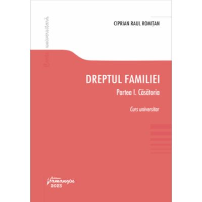 In aceasta prima parte a cursului de Dreptul familiei sunt prezentate institutiile cuprinse in Cartea a II-a Despre familie Titlul I Dispozitii generale si Titlul II Casatoria din Codul civil si anume Logodna art. 266-270 Incheierea casatoriei art. 271-289 Formalitati ulterioare incheierii casatoriei art. 290-292 Nulitatea casatoriei art. 293-306 Drepturile si indatoririle personale ale sotilor art. 307-311 Drepturile si obligatiile patrimoniale ale sotilor art. 312-372 si Desfacerea casatoriei art. 373-404 . Prin continutul sau cursul Dreptul familiei. Casatoria se adreseaza in primul rand studentilor din cadrul facultatilor de drept masteranzilor doctoranzilor dar este si un instrument util de lucru pentru teoreticienii si practicienii dreptului precum si pentru cei ce sunt preocupati de domeniul raporturilor de familie.Specificatii
