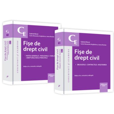 Fisele de drept civil reprezinta in acest moment unica lucrare in materia dreptului civil care trateaza unitar tematica pentru toate concursurile de admitere si definitivat in profesiile juridice. Cartea Fise de drept civil este destinata mai ales candidatilor ce se pregatesc pentru aceste concursuri fiind alcatuita astfel incat sa acopere in primul rand acele materii si institutii ale dreptului civil care fac parte din tematica concursurilor juridice nationale. In al doilea rand aceasta carte este adresata studentilor care se pregatesc pentru examenele de an sau pentru examenul de licenta avand avantajul de a prezenta materia in mod concis si accesibil axat pe intelegerea si asimilarea notiunilor de baza ale dreptului civil deci fara teoriile si dezbaterile doctrinare de multe ori inevitabile in cursurile sau tratatele publicate dupa intrarea in vigoare a noului Cod civil. Pe parcursul elaborarii lucrarii s-a dovedit ca unele dintre institutiile dreptului civil sunt prea ample ca sa poata fi tratate schematizat asa cum presupune conceptul fiselor. De aceea si prezentarea lor s-a facut de o maniera mai apropiata sintezelor si notelor de curs. Cu toate acestea am preferat sa pastram titulatura de fise pentru a delimita aceasta carte de cursurile universitare clasice dar si pentru a ne incadra in conceptia de ansamblu a editurii care dezvolta o intreaga serie de fise pentru concursurile si examenele juridice. Dat fiind numarul mare de pagini care s-au adaugat inca de la editia a 5-a pentru a evita riscul desprinderii filelor si aceasta noua editie este tiparita tot in doua volume structurate astfel 1. Partea generala. Persoanele. Familia. Drepturile reale principale 2. Obligatiile. Contractele. Mostenirea. Despre editia a 8-a 41 de fise din toate materiile dreptului civil Partea generala Persoanele Drepturile reale Obligatiile Contractele Mostenirea Familia. O editie amplu revizuita si adaugita. Acopera tematica pentru examenele de admitere la INM si in magistratura de primire in profesia de avocat avocat stagiar precum si cel de admitere in notariat notari stagiari . Fisele existente au fost actualizate in raport de modificarile legislative intervenite in ultimii doi ani si restructurate sau completate cu institutii sau probleme noi dezbatute in literatura de specialitate sau jurisprudenta. Informatia din editiile anterioare a fost imbogatita cu precizari corelari cu alte institutii exemple practice si spete recente din practica judiciara. Cuprinde trimiteri la jurisprudenta obligatorie relevanta in materie civila respectiv deciziile Curtii Constitutionale precum si deciziile Inaltei Curti de Casatie si Justitie pronuntate in recursuri in interesul legii si cele privind dezlegarea unor probleme de drept in materie civila. Explicatiile continute jurisprudenta citata numeroasele exemple si tabele comparative inlesnesc procesul de invatare retinere si intelegere antreneaza si dezvolta procesul de interpretare si aplicare a normelor de drept civil in contextul testelor tip grile si mini-spete. Despre seria Concursuri si examene Seria Concursuri si examene grupeaza toate lucrarile de sinteze fise spete si grile publicate de Editura Hamangiu si este o serie special dedicata studentilor in vederea pregatirii examenelor de an sau de licenta si candidatilor la concursurile de admitere si definitivat in profesiile juridice. Cartile de fise sunt publicate intr-o prezentare grafica adaptata acestui concept ce include multe tabele si scheme facilitand vizualizarea si asimilarea rapida a informatiilor necesare promovarii examenelor. In ultimii ani conceptul de fise s-a impus din ce in ce mai mult in fata tratatelor cursurilor si monografiilor elaborate in materiile ce fac parte din tematica propusa pentru admiterea la Institutul National al Magistraturii examenul de primire in profesia de avocat ori examenele de an licenta ori definitivat INM INPPA . Cuprinsul acestor carti este conceput astfel incat cititorul sa dobandeasca o viziune clara si de ansamblu asupra materiei care sa asigure fixarea rapida a cunostintelor necesare pentru promovarea diferitelor examene si concursuri. Informatiile sunt usor accesibile structurate intr-o forma logica actualizate din punct de vedere legislativ si completate cu deciziile obligatorii ale Curtii Constitutionale si ale Inaltei Curti de Casatie si Justitie.