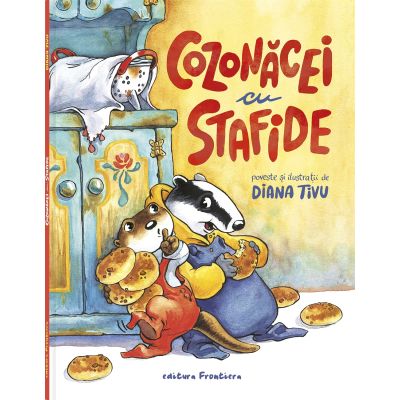 Vidra si Bursuc au pofta de cozonacei cu stafide. Cei mai buni cozonacei ii face domnul Urs un excelent bucatar dar si o figura de temut pentru animalele padurii. Cum sa intre Vidra si Bursuc in bucataria lui si sa se infrupte din cozonacei fara sa fie prinsi Vidra este indrazneata si are multe idei practice. Bursucul este temator dar ascultator. Bine si un pic cu capul in nori pentru ca de multe ori pune in pericol planul Vidrei prin copilariile lui. Nu se poate abtine sa nu stranute desi i se spune in repetate randuri sa nu faca zgomot. Nu prea intelege cum sa te cateri pe o scara fara trepte apoi pricepe ca are in fata o usa de dulap nu o scara. Cei doi prieteni reusesc sa intre in cele din urma in bucataria domnului Urs si sa-si umple sacul de cozonacei. Dar cand dau sa plece sunt surprinsi de Urs cu sacul in spate Despre autoare Diana Tivu este ilustratoare si autoare de carti pentru copii. Cozonacei cu stafide este primul proiect de banda desenata pentru copii pe care il semneaza. L-a realizat la incurajarile artistului italian Sergio Ruzzier creatorul indragitei serii Puiu si Vulpoi care a apreciat atat povestea in sine cat si tehnica traditionala in care au fost facute ilustratiile desen in penita si culoare in acuarela.