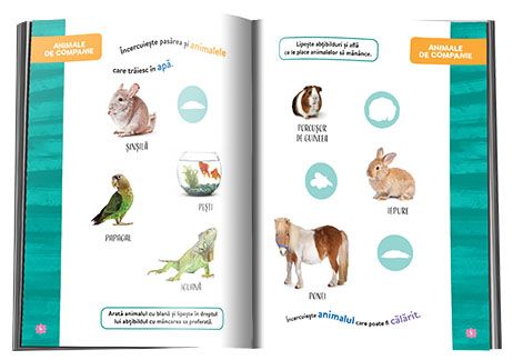 Invat animalele contine activitati cu 70 de abtibilduri. Copilul va putea sa recunoasca animale pasari si insecte cu care este familiarizat deja dar si sa invete despre altele noi din habitate diferite si colturi indepartate ale lumii. Cu ajutorul colectiei Activitati cu stickere copilul tau va putea nu numai sa invete notiuni noi dar si sa-si dezvolte abilitati importante cum ar fi motricitatea fina coordonarea mana-ochi si indemanarea. Activitatile sunt adaptate varstei iar abtibildurile il vor ajuta sa-si fixeze cunostintele nou dobandite.Specificatii
