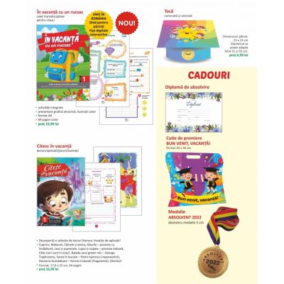 Pachetul de premiere este special conceput pentru a-i recompensa pe elevi la final de an scolar si a sprijini exersarea pe durata vacantei de vara. In vacanta cu un rucsac - caiet transdisciplinar cu jocuri exercitii si aplicatii format A4 64 pagini Citesc in vacanta - lecturi aplicatii jocuri ilustratii format B5 64 pagini Diploma de absolvire cu model floral Medalie cu mesajul Absolvent 2022 Toca multicolora Cutie cartonata cu mesajul Bun venit vacantaSpecificatii